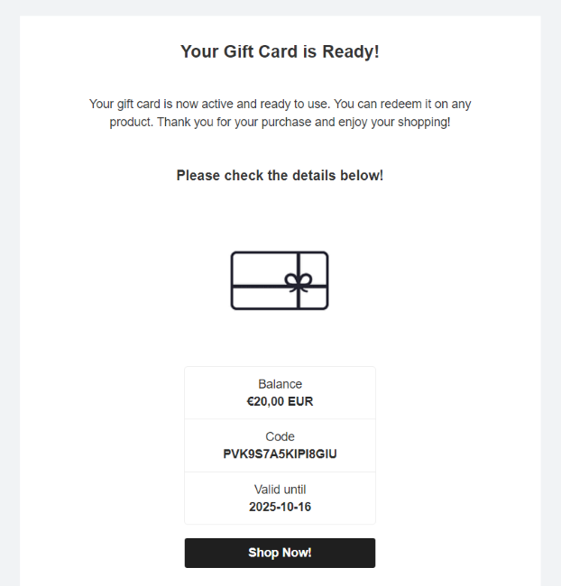 After a customer buys a gift card, the email address they provided will receive an email letting them know a gift card was purchased, and its balance and code to use inside the store.